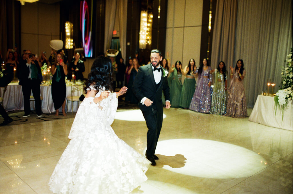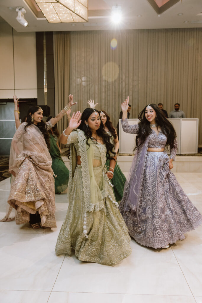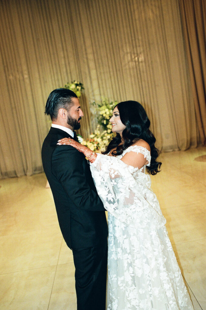 The wedding day itself began with a traditional Indian ceremony in Los Angeles. I was personally obsessed with all of the beautiful, colorful dresses. After the ceremony, we moved back to The Oaks Club with their family and bridal party. This group was cracking me up and was just so fun to work with. You meet a lot of different wedding parties as a Los Angeles wedding photographer. Some groups stick in your mind. This one definitely did! They all went home for a nap before we headed to the reception at the L.A. Banquets venue, The Landmark. I’m actually so stoked because I’ll be back to photographer another wedding here in 2026. I didn’t even put two and two together until I was shooting the reception.
